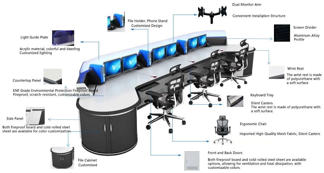 Наш операторский стол оснащён универсальными функциями, включая кронштейны для мониторов, держатели для телефонов, подставки для клавиатуры, шкафы для документов и эргономичные кресла. Благодаря эргономичным и интеллектуальным модулям он удовлетворяет разнообразные требования государственных и корпоративных пользователей. Стол поддерживает широкий спектр беспроводных, проводных и настольных коммуникационных сервисов.
