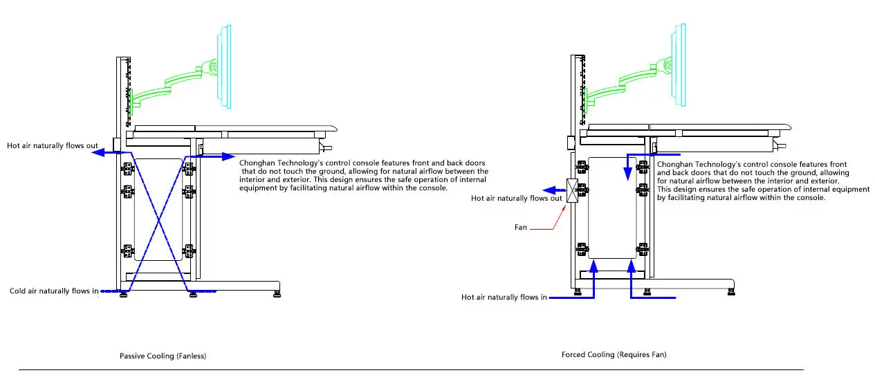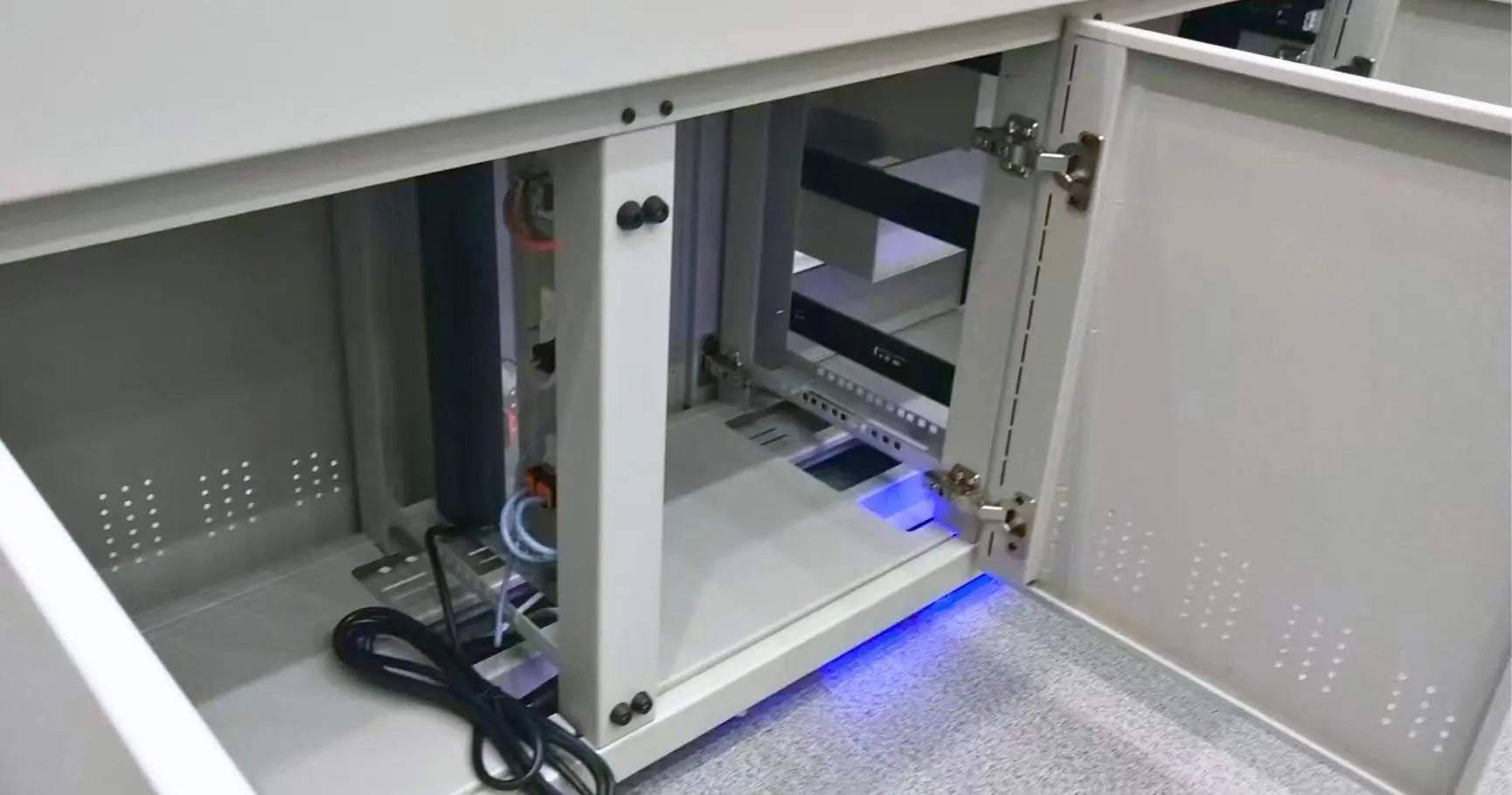 Инновационная система вентиляции операторского стола обеспечивает оптимальный воздушный поток без встроенных вентиляторов. Холодный воздух поступает спереди, сзади и снизу, циркулирует внутри и выходит сверху, поддерживая безопасность и эффективность оборудования. Вентиляционные отверстия (30% степень проницаемости) на передних и задних дверях улучшают приток воздуха, а тёплый воздух отводится от операторов, создавая более здоровую рабочую среду.